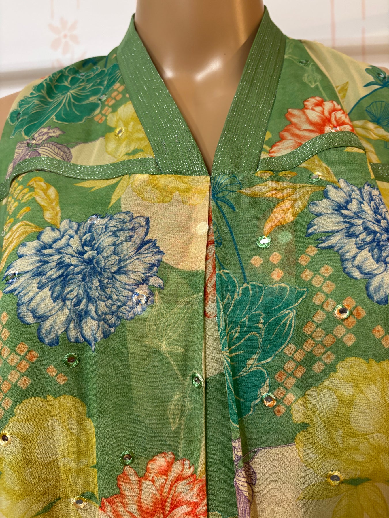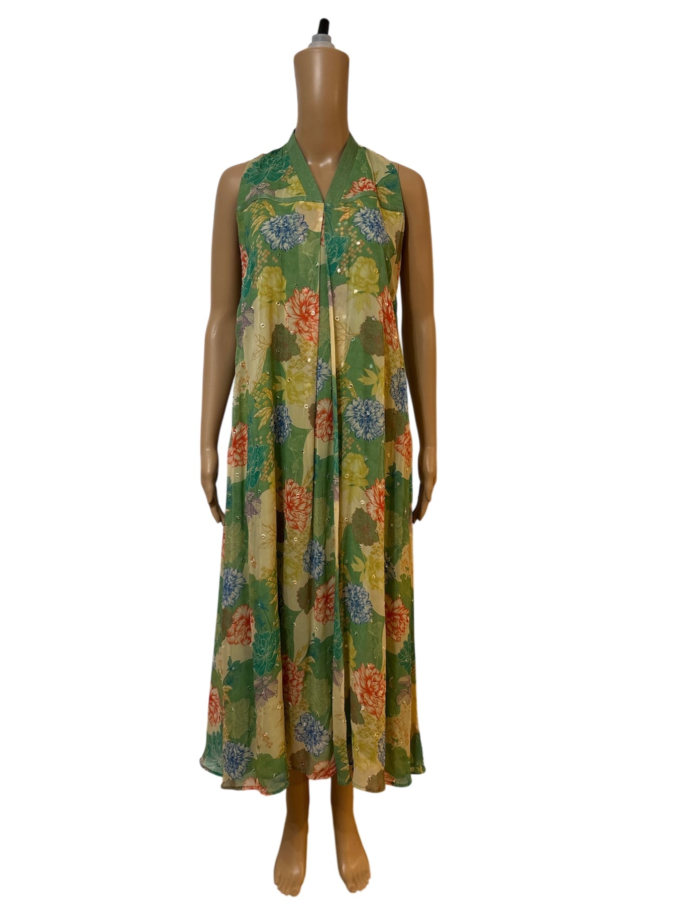 This pastel green georgette halter neck dress features an elegant silhouette that flatters every figure with its flowing, lightweight fabric. The subtle tiny mirror work adds a delicate shimmer, enhancing the dress’s understated charm without overpowering its soft, graceful design. Perfect for occasions where you want to stand out with sophistication and ease.