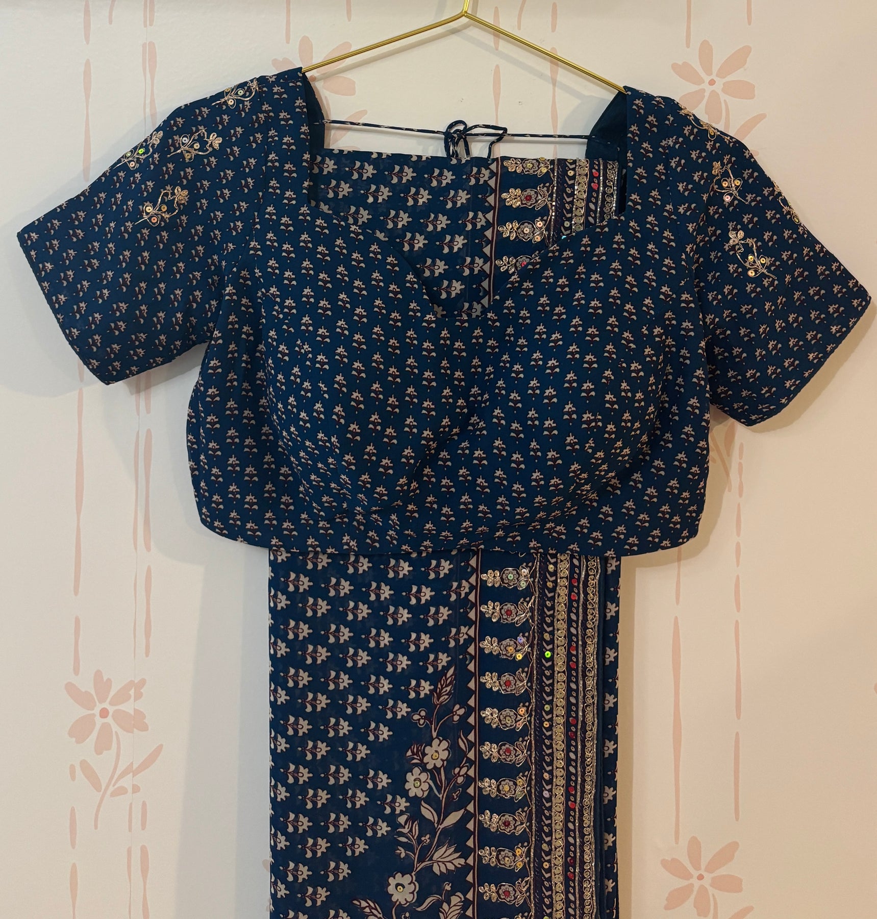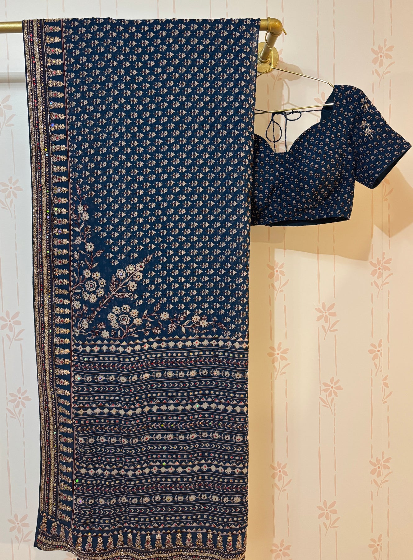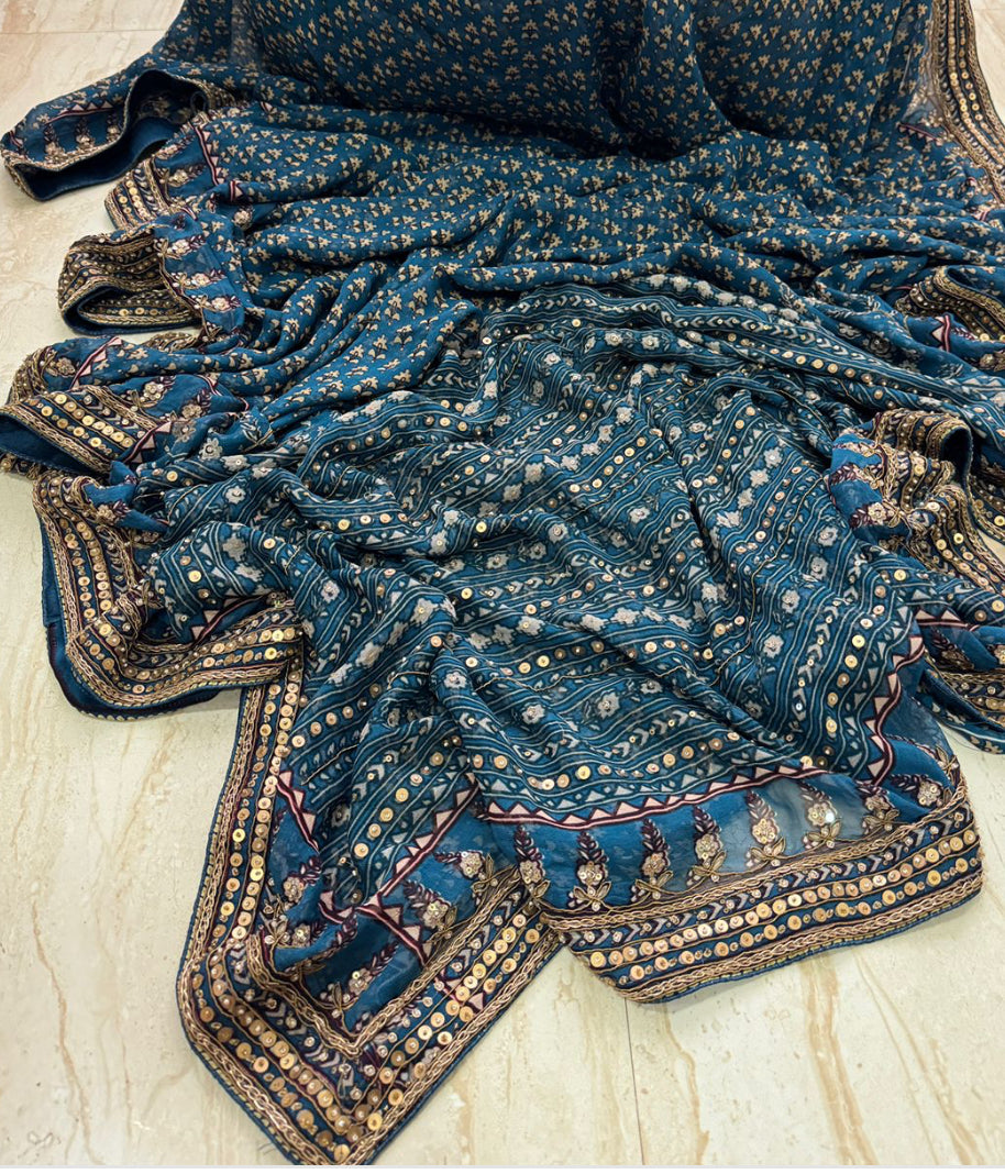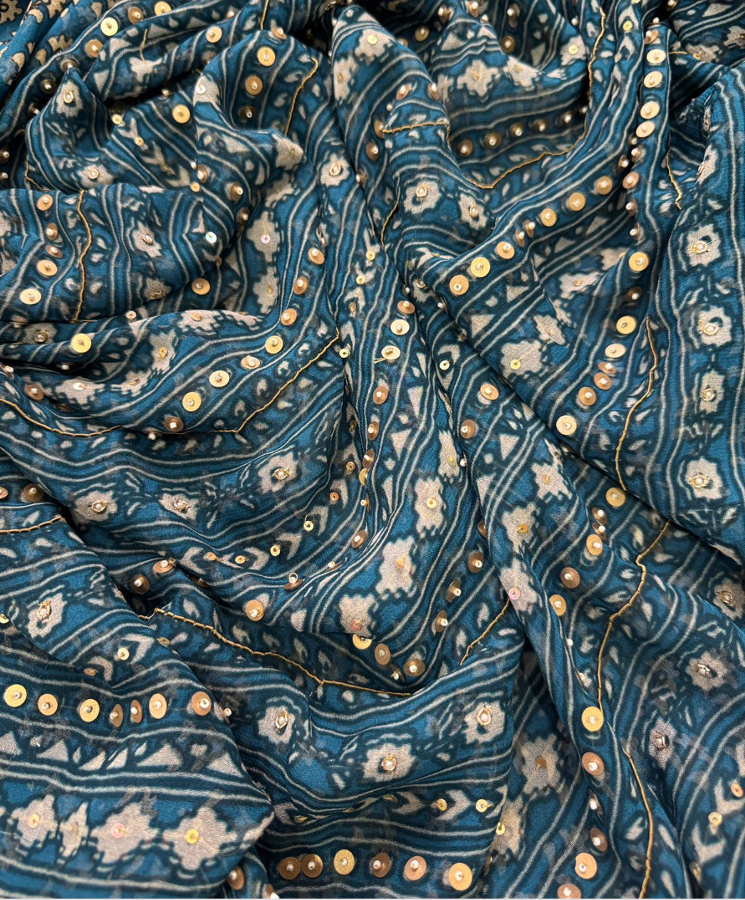 Channel red-carpet glamour with this Kareena Kapoor-inspired georgette saree. Intricate pita work and embroidery embellish the border and pallu, while the blue printed design commands attention. The tailored blouse features structured padding for a polished silhouette. Crafted from premium georgette, this saree drapes beautifully with effortless grace—ideal for weddings, festivals, and standout moments.