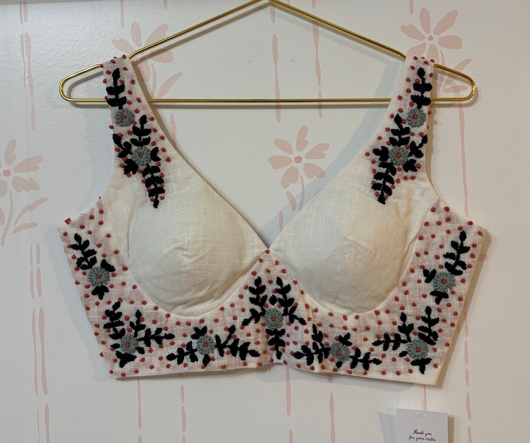 Experience elegance and comfort with this Cotton French Knot Embroidery Blouse. Crafted from soft white cotton, it features delicate hand embroidery in a beautiful color palette that enhances its charm. The V-neck is padded for a structured yet breathable fit, complemented by a stylish open back design. Perfect for warm days, this blouse offers a flattering silhouette without compromising on comfort. Elevate your wardrobe with this effortlessly chic and breathable piece.