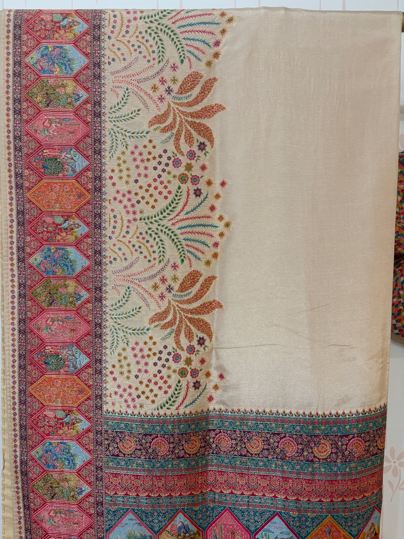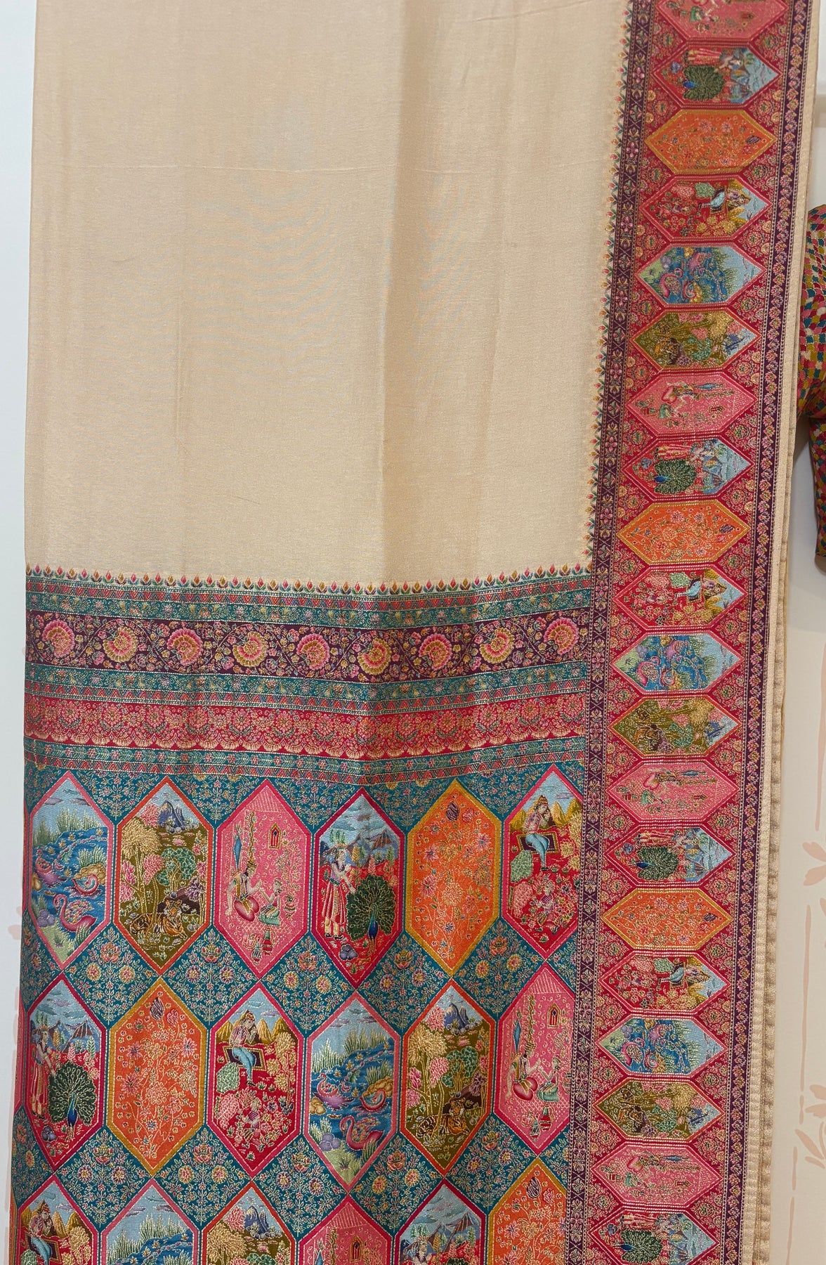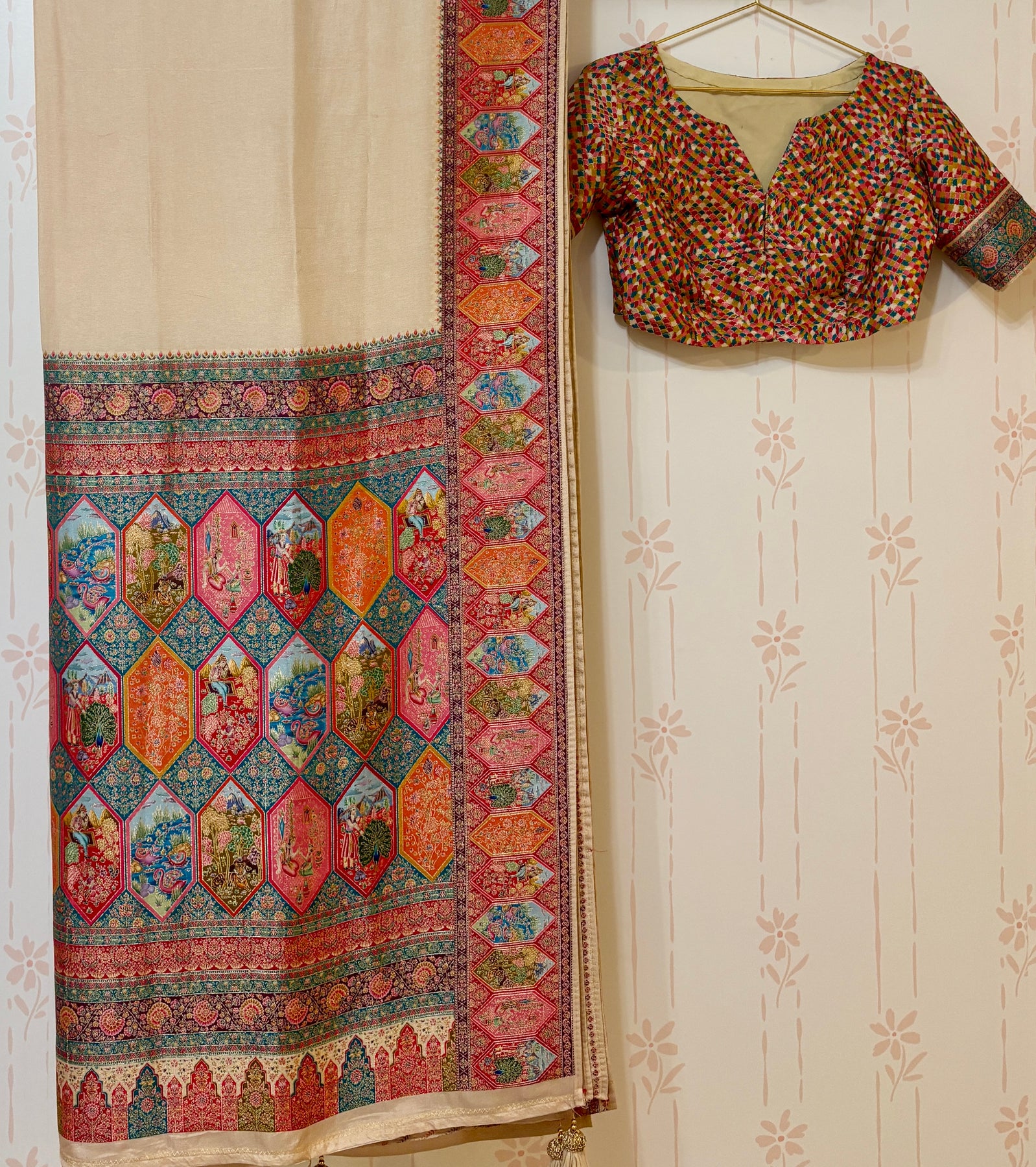 This elegant Cream saree features an intricately woven pallu and border, adorned with vibrant traditional motifs in magenta, teal, orange, and gold. The lower panel showcases rich floral and royal scenes, giving it a regal tapestry look. Paired with a multicolor blouse featuring a checkered pattern and matching brocade-style sleeve cuffs, this ensemble blends classic charm with festive vibrance—perfect for weddings or special occasions.