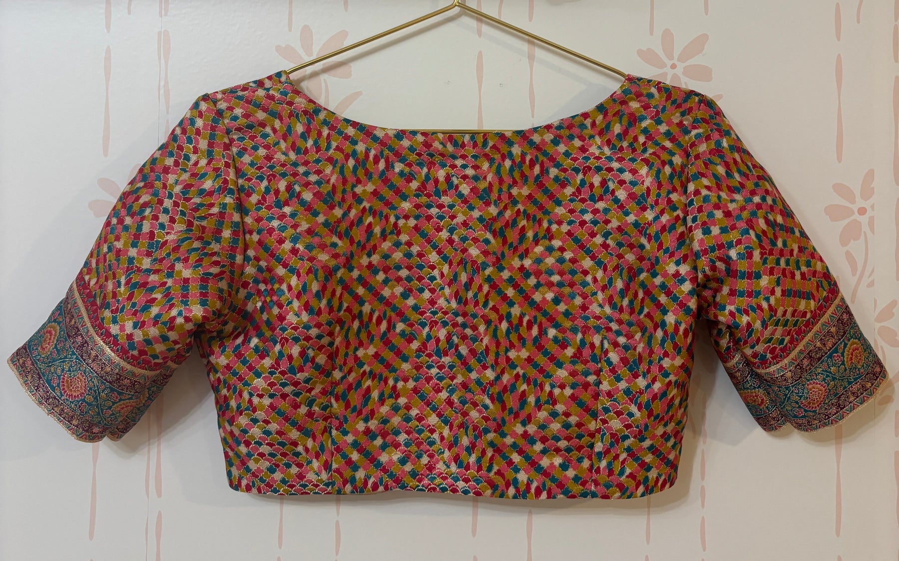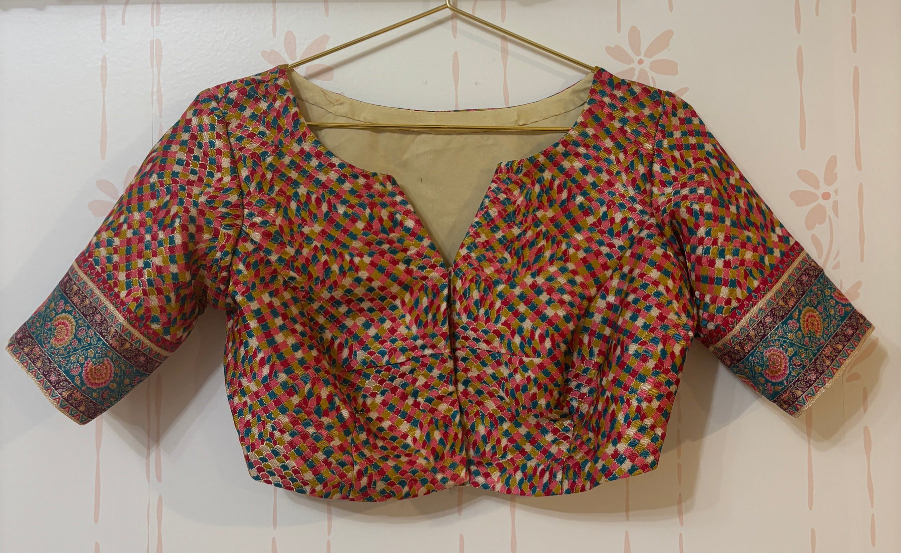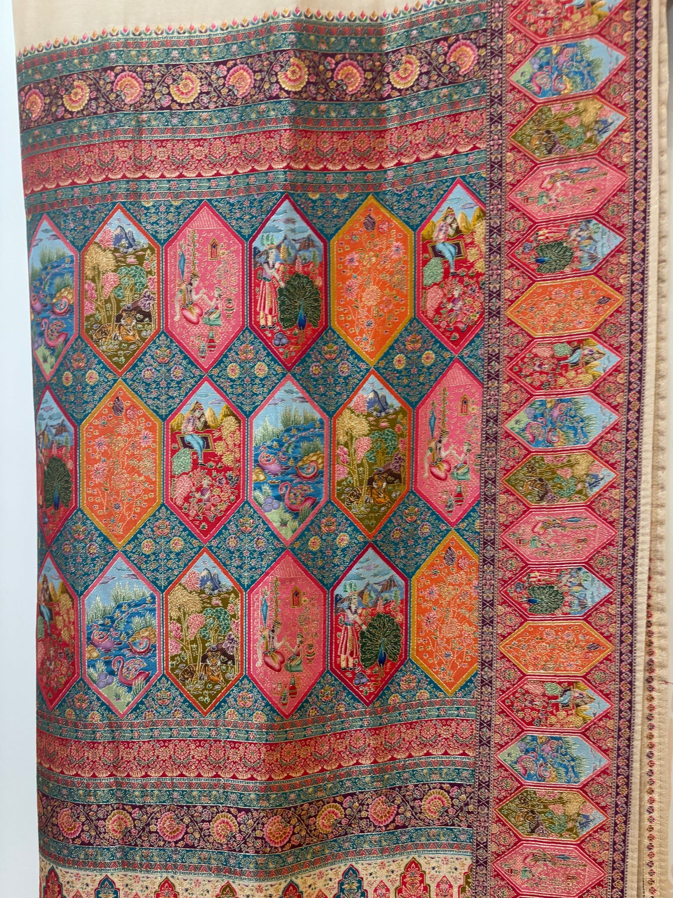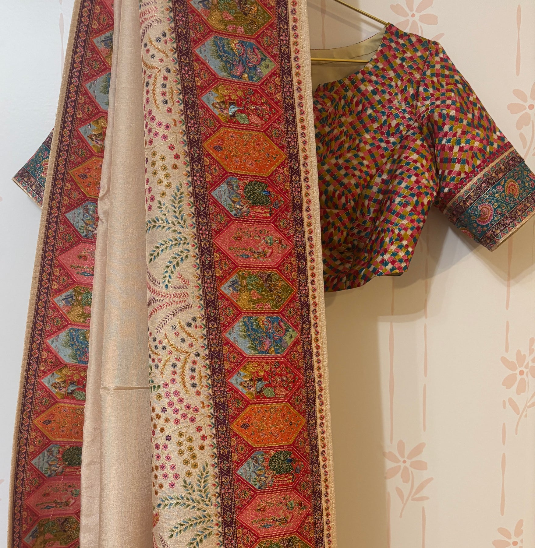 This elegant Cream saree features an intricately woven pallu and border, adorned with vibrant traditional motifs in magenta, teal, orange, and gold. The lower panel showcases rich floral and royal scenes, giving it a regal tapestry look. Paired with a multicolor blouse featuring a checkered pattern and matching brocade-style sleeve cuffs, this ensemble blends classic charm with festive vibrance—perfect for weddings or special occasions.