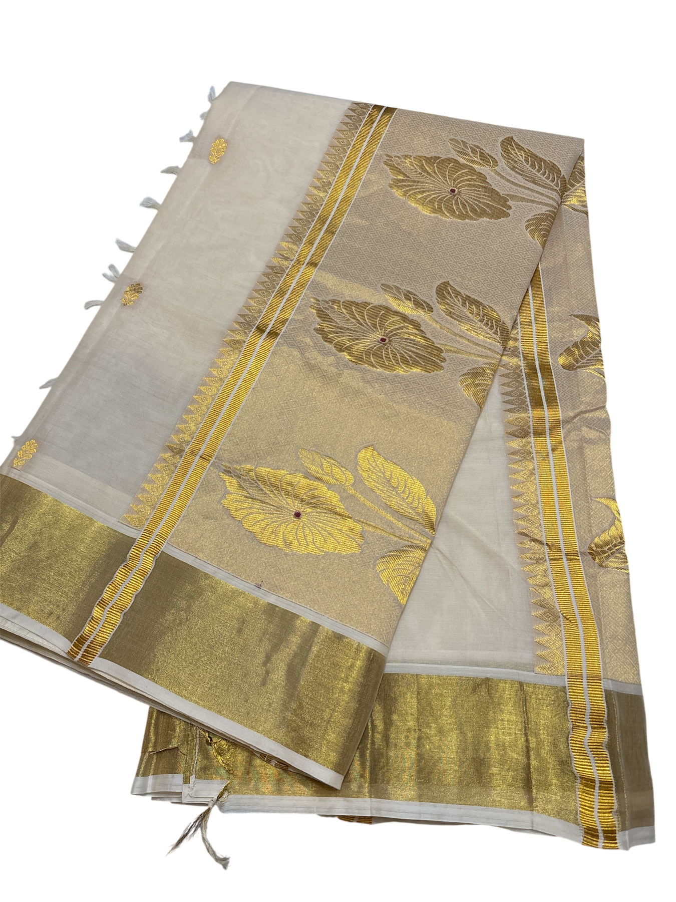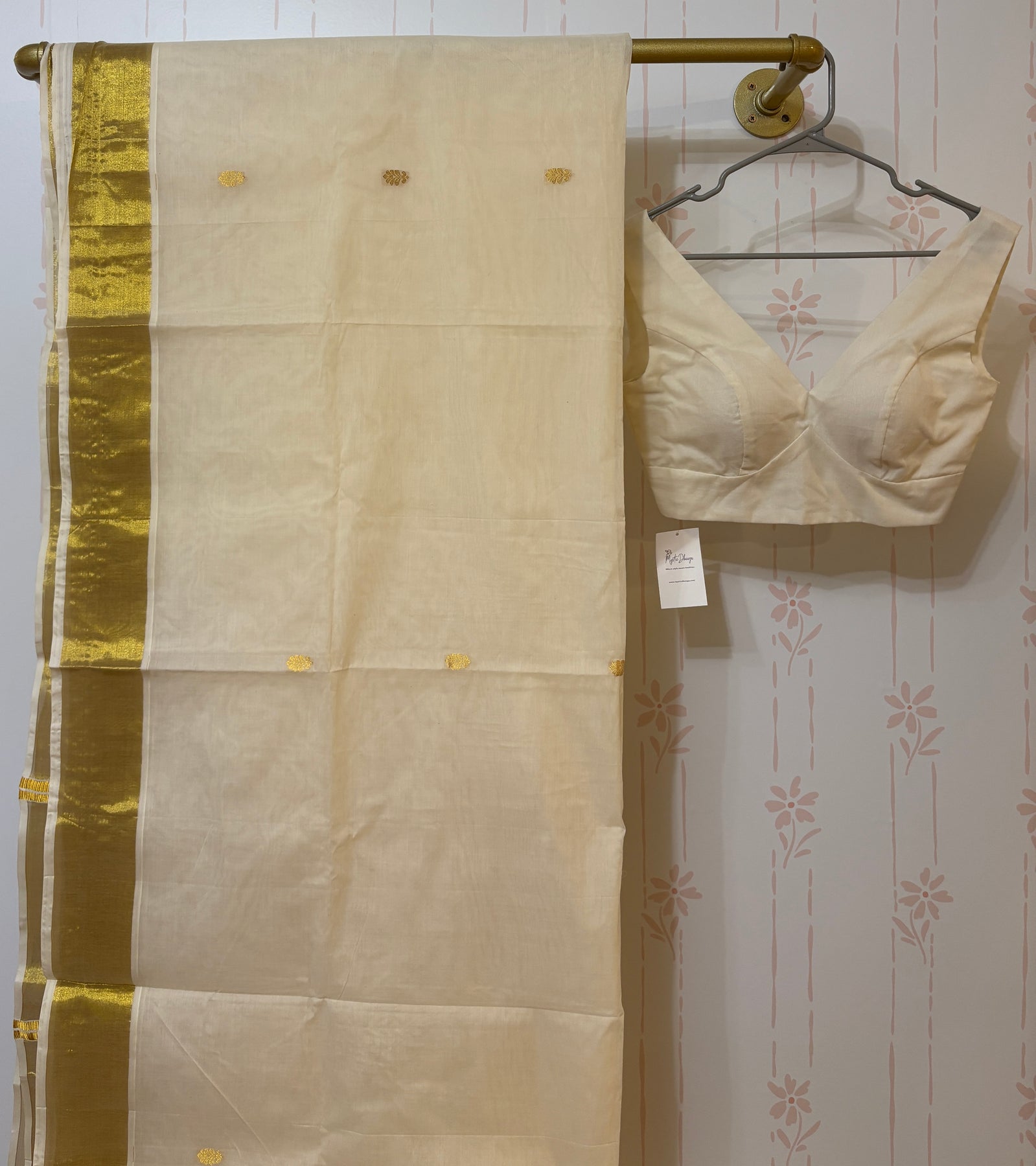 Celebrate this Onam with this Kerala cotton kasavu saree with zari woven small flowers throughout the body and big beautiful flowers in the pallu. It comes with a stylish deep v neck blouse with pads and back closure.