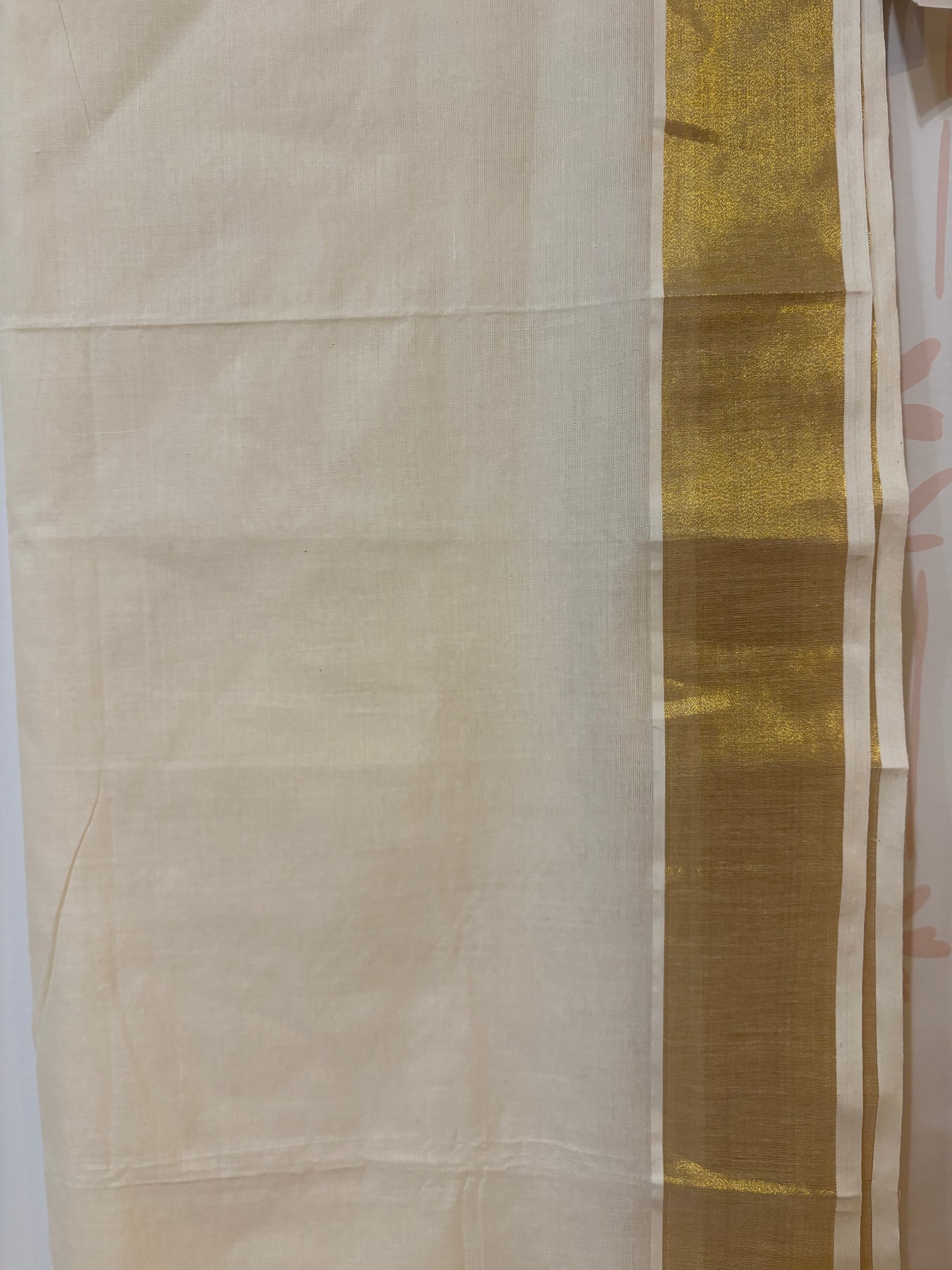 Elevate your traditional wardrobe with this elegant Kerala Kasavu Saree and Blouse Set. Featuring the timeless cream fabric adorned with distinctive golden borders, this saree embodies cultural grace and sophistication. The matching designer blouse with front hooks closure complements the look perfectly, making it ideal for festive occasions or special celebrations. Experience the blend of comfort and classic style that highlights your heritage with every drape.