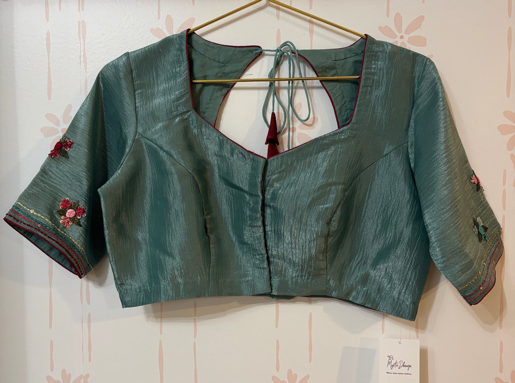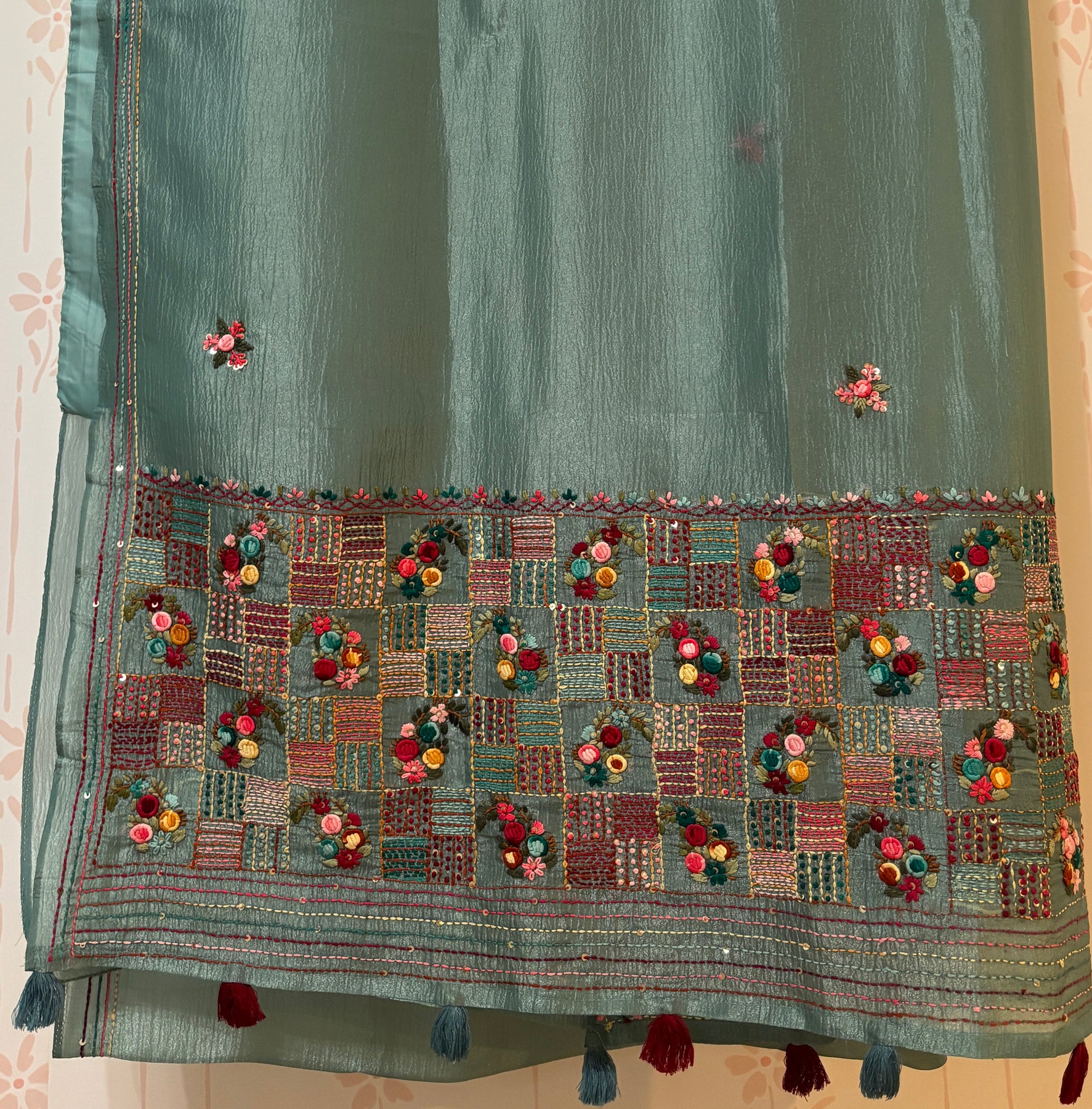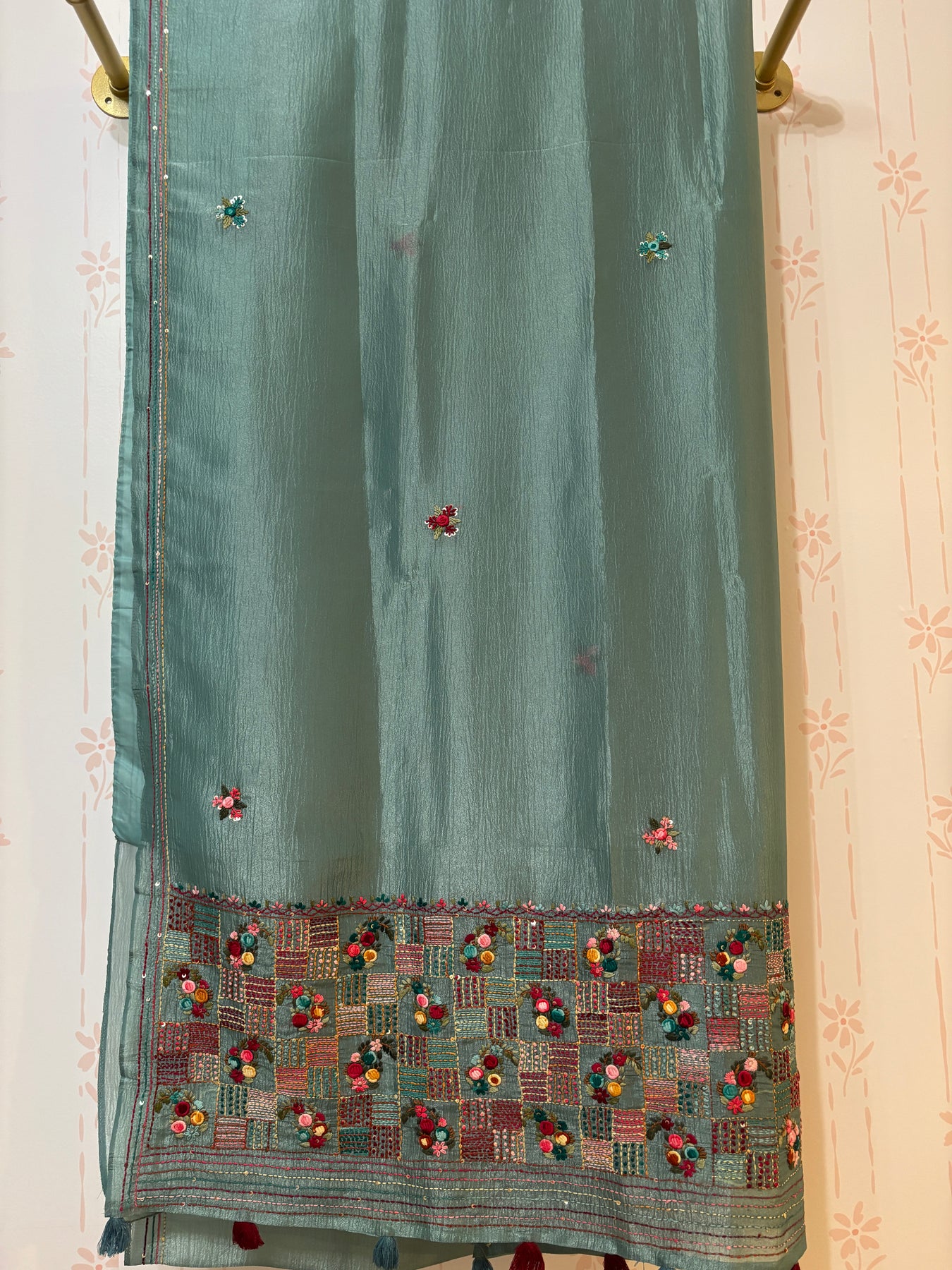 Sage green Crushed crepe French Knot embroidery saree and Blouse Set