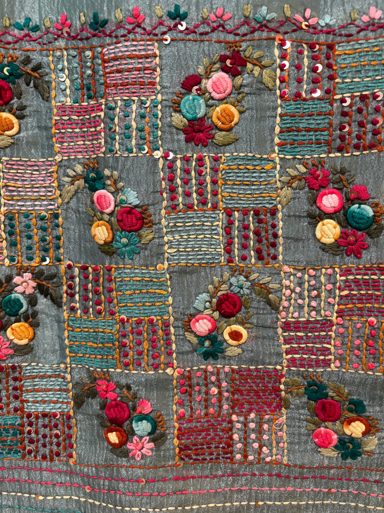 Elevate your wardrobe with this sage green crushed crepe saree, featuring delicate French knot embroidery throughout the fabric. The intricately embroidered pallu adds a touch of elegance, making it perfect for special occasions. This lightweight saree comes with a stitched blouse that complements the look with subtle embroidery, ensuring a graceful and cohesive ensemble. Embrace timeless charm and effortless style in this beautifully crafted set.