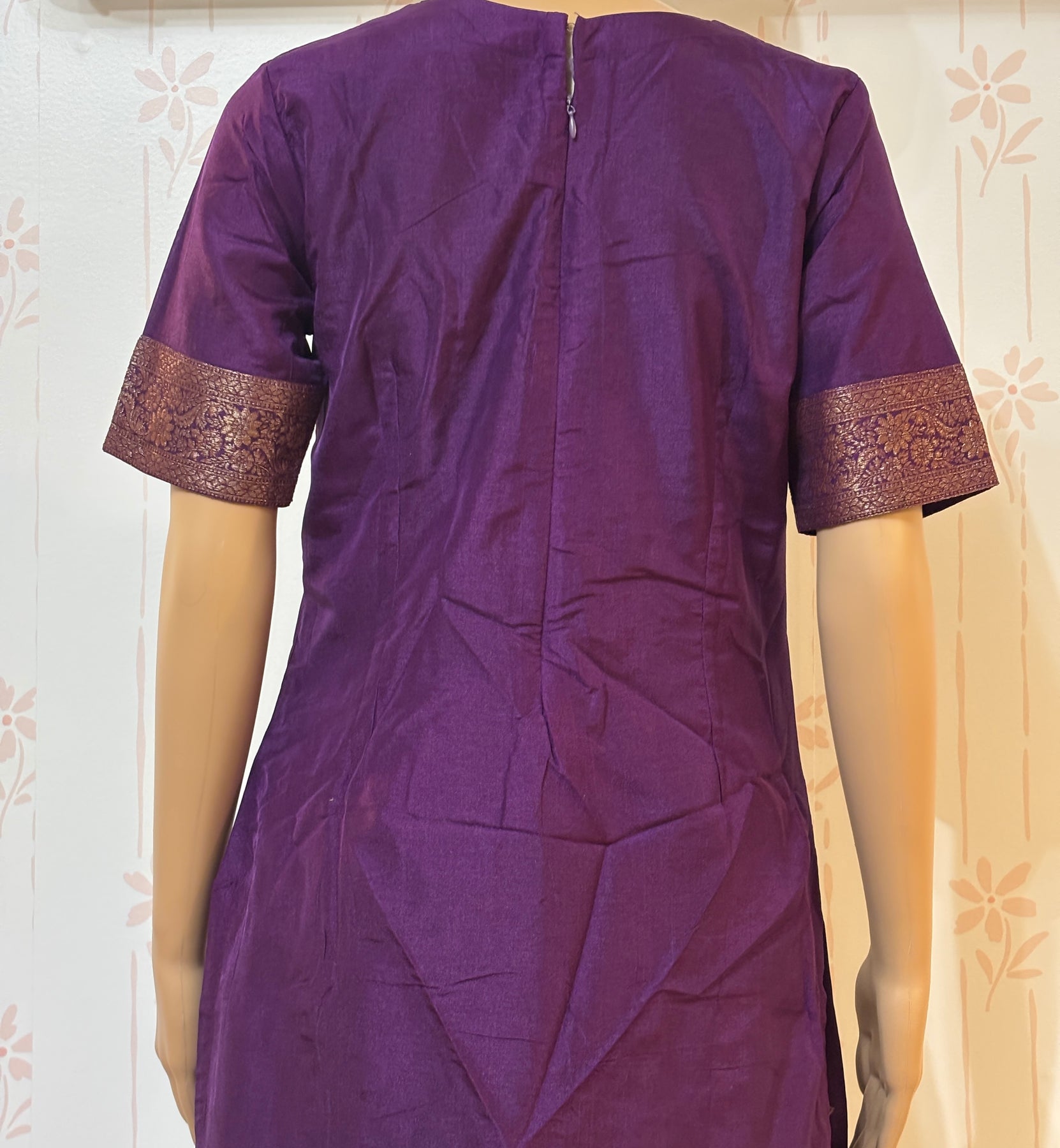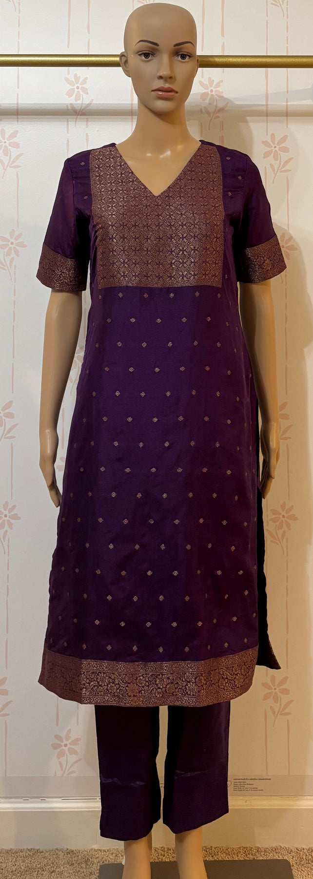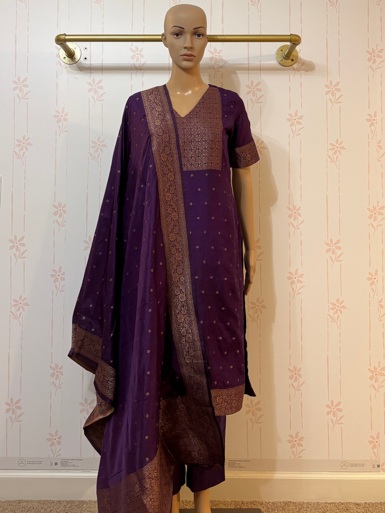 Elevate your ethnic wardrobe with this stunning violet Banarasi suit set. Crafted from luxurious Banarasi silk, this three-piece ensemble features intricate traditional weaving that showcases timeless elegance. The set includes a beautifully tailored kurta with a zipper closure in the back, coordinating dupatta, and matching bottom, perfect for weddings, festivals, or special occasions. The rich violet hue complements all skin tones, while the authentic Banarasi craftsmanship ensures you're investing in quality that lasts. Experience the sophistication of heritage textiles with modern comfort and style.